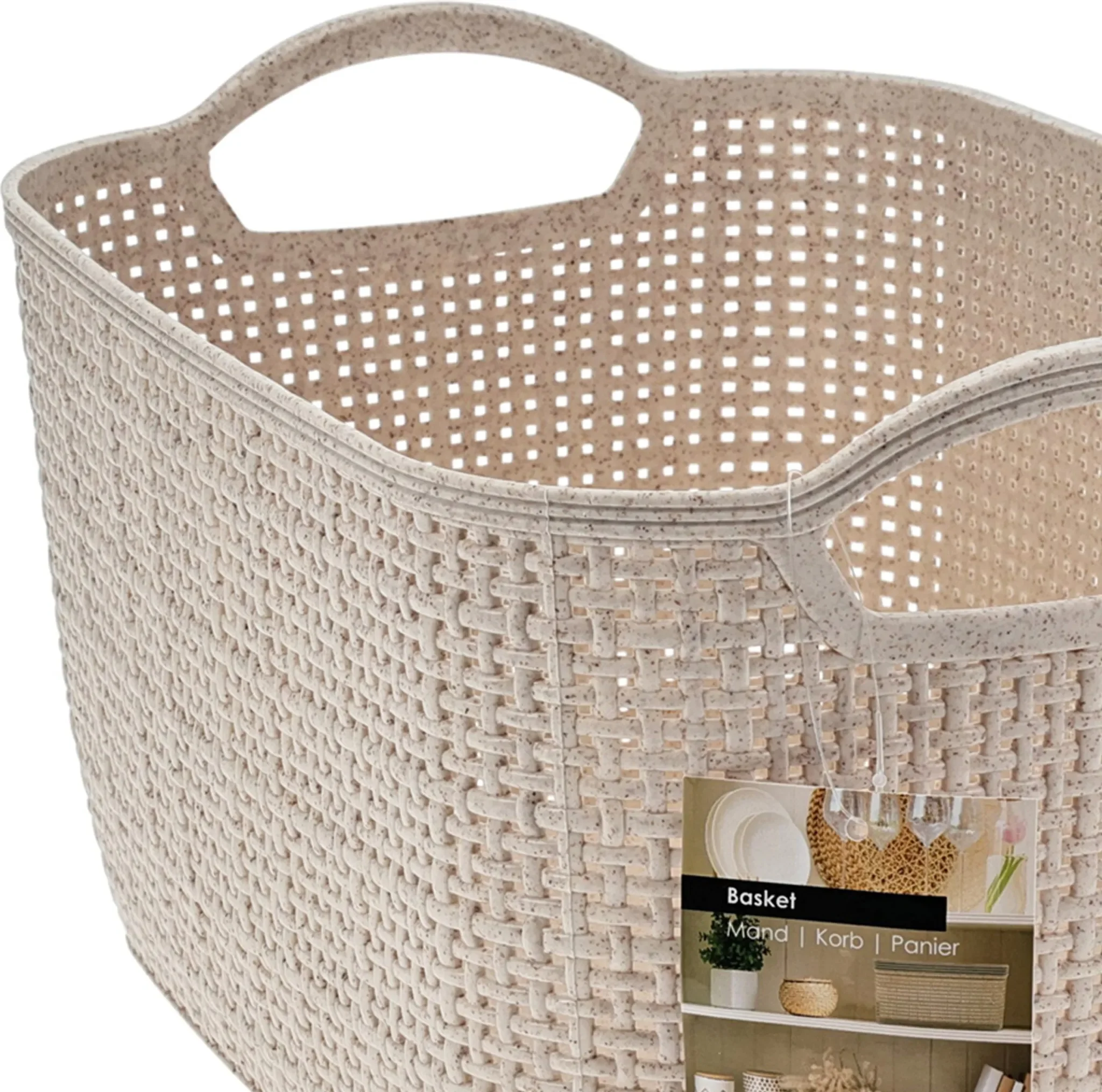 Das dekorative Flechtmuster verleiht dem Korb eine wohnliche Optik, während das strapazierfähige Kunststoffmaterial für Stabilität und Langlebigkeit sorgt. Die integrierten Kunststoffgriffe ermöglichen ein bequemes Tragen und Umstellen – ideal für den täglichen Einsatz im Haushalt.