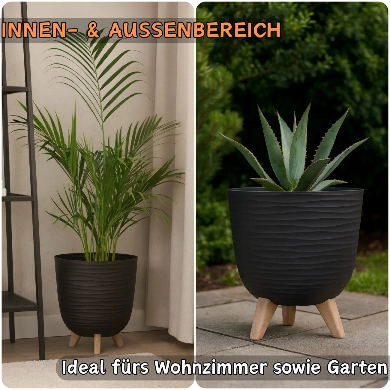 Dieser runde Blumentopf mit moderner Wellenoptik verbindet zeitgemäßes Design mit hoher Funktionalität. Die dekorativen, abnehmbaren Standfüße in Holzoptik sorgen für eine erhöhte und stabile Platzierung und machen den Pflanztopf zu einem stilvollen Blickfang im Wohnraum, auf dem Balkon oder im Garten.