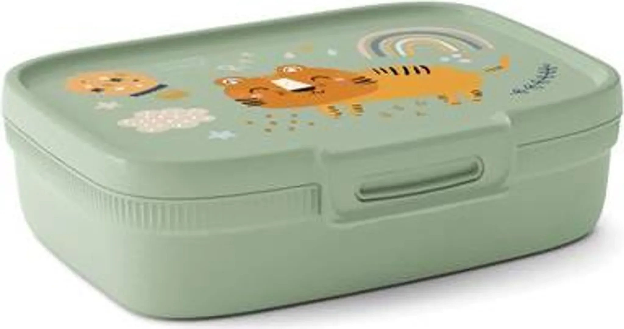 Der transparente Deckel mit stabilem Clipverschluss lässt sich leicht öffnen und schließen und schützt den Inhalt zuverlässig vor äußeren Einflüssen. Das kindgerechte Tiermotiv auf dem Deckel sorgt für einen fröhlichen Akzent und macht die Box besonders beliebt bei Kindern.