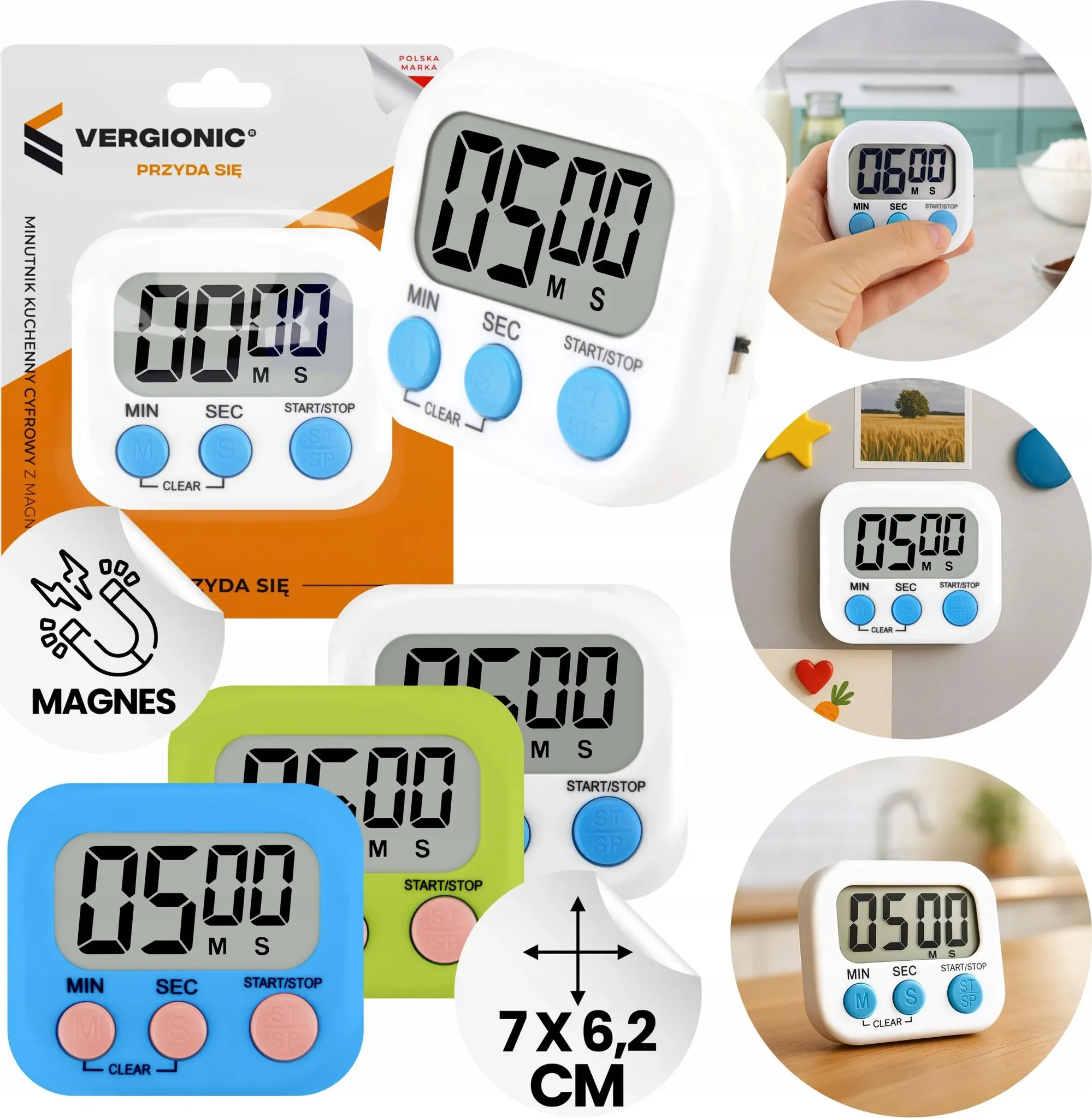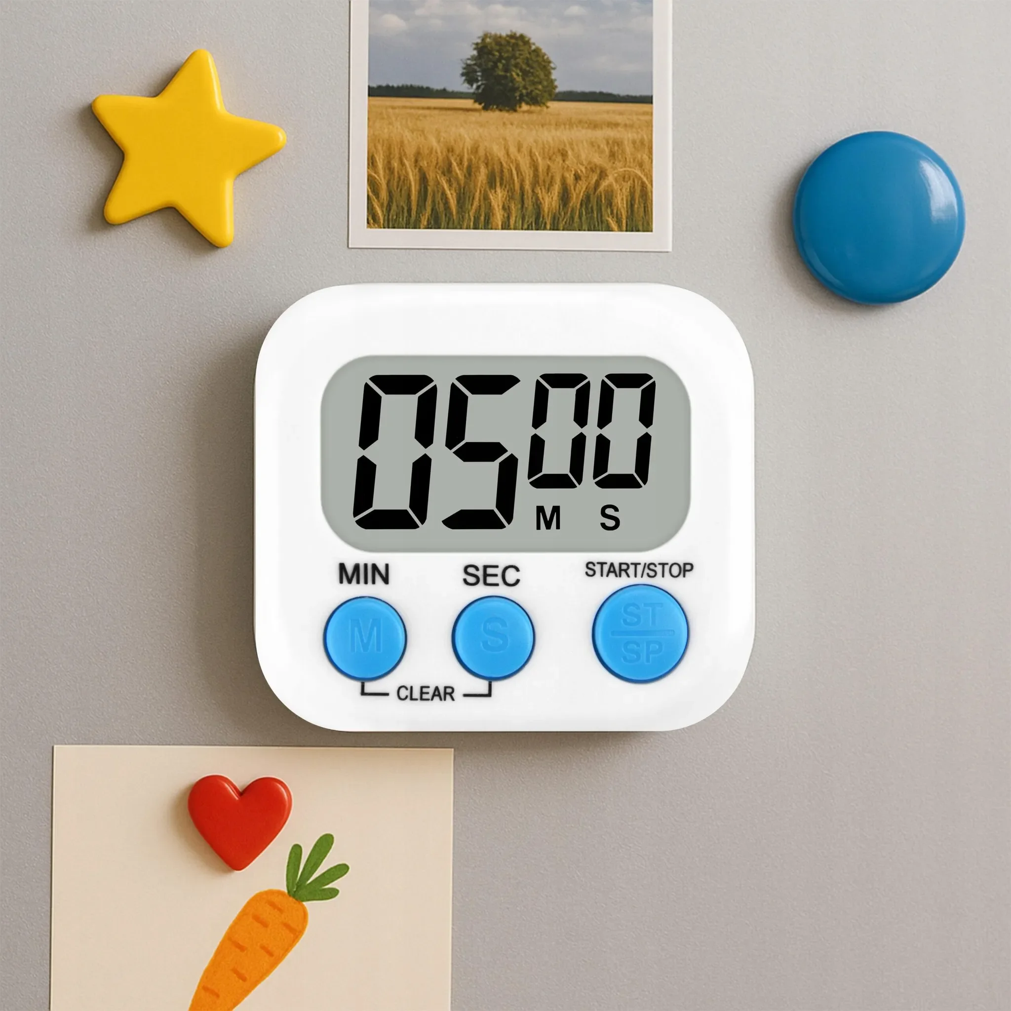 Das kompakte Gerät verfügt über ein gut ablesbares LCD-Display, intuitive Tasten für Minuten- und Sekunden-Einstellung sowie einen eingebauten Magneten und ein Aufhängeloch, sodass es flexibel an Kühlschrank, Wand oder Metallflächen befestigt werden kann. Leicht, platzsparend und in verschiedenen Farben erhältlich (weiß, grün, blau).