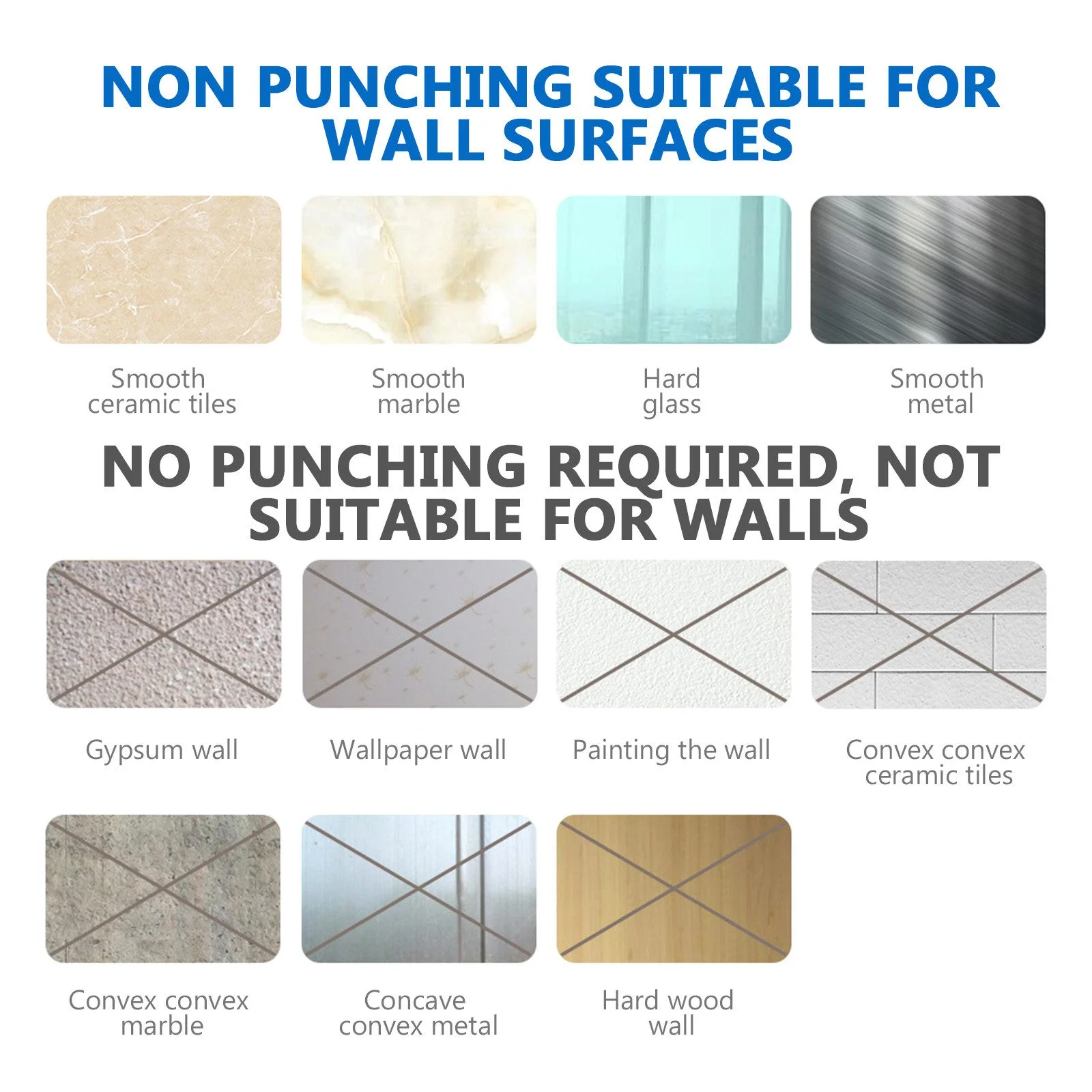 Die Halterung kann auf glatten Oberflächen wie Keramik, Glas, Spiegel, Marmor oder Fliesen angebracht werden. Dank der starken selbstklebenden Aufkleber hält der Halter zuverlässig bis zu 2 kg. Kein Bohren erforderlich – platzsparend und flexibel einsetzbar.