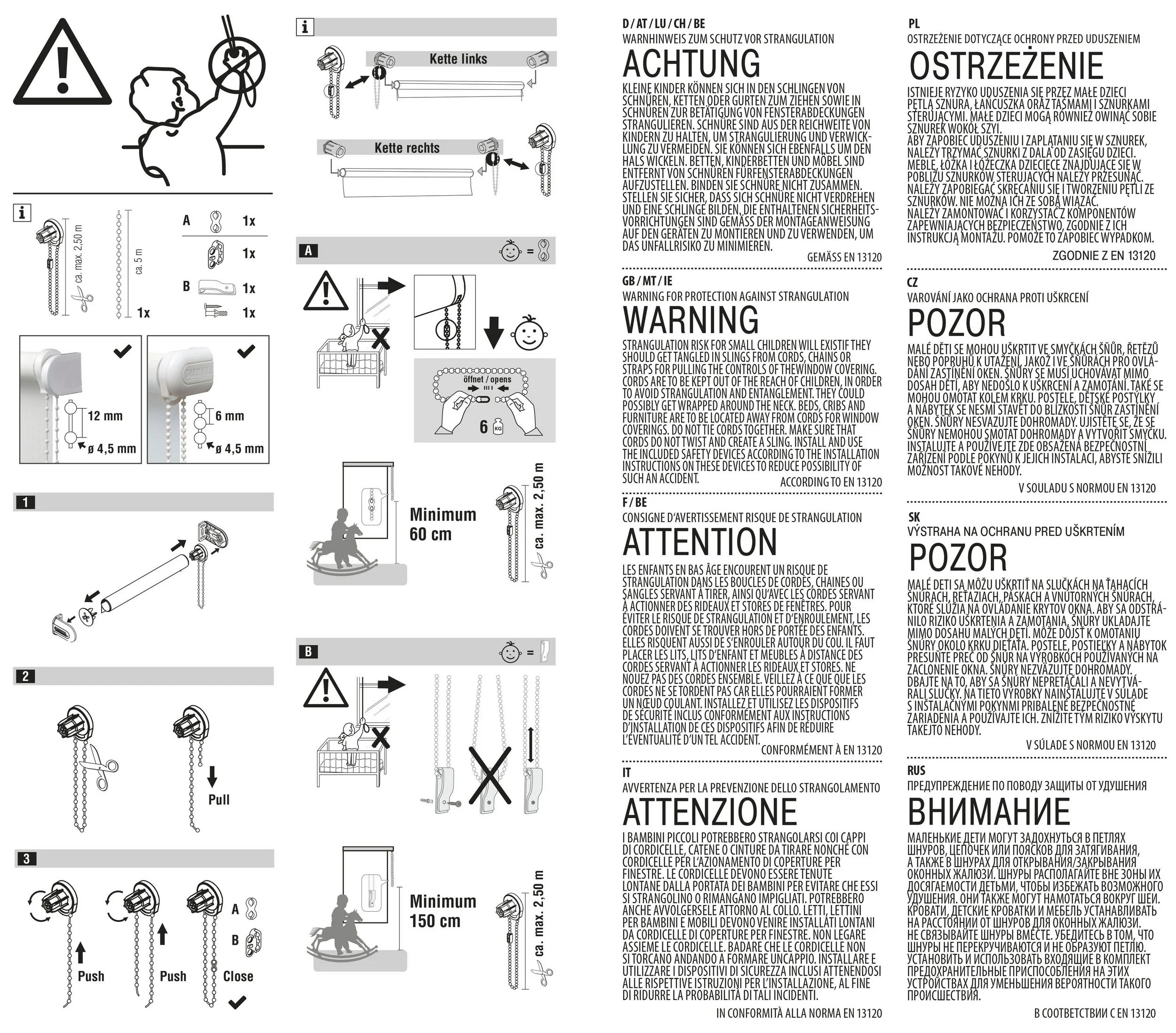 Diese Ersatzkette eignet sich für Seitenzugrollos mit Kugeldurchmesser 4,5 mm und einem Kugelabstand von 12 mm. Die 5 m lange Kette ermöglicht eine komfortable Bedienung von Rollos bis zu 2,50 m Höhe. Sie kann auf die gewünschte Länge gekürzt werden und ist sowohl für bestehende Ketten mit 6 mm Abstand als auch 12 mm Kugelabstand einsetzbar.